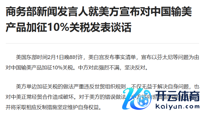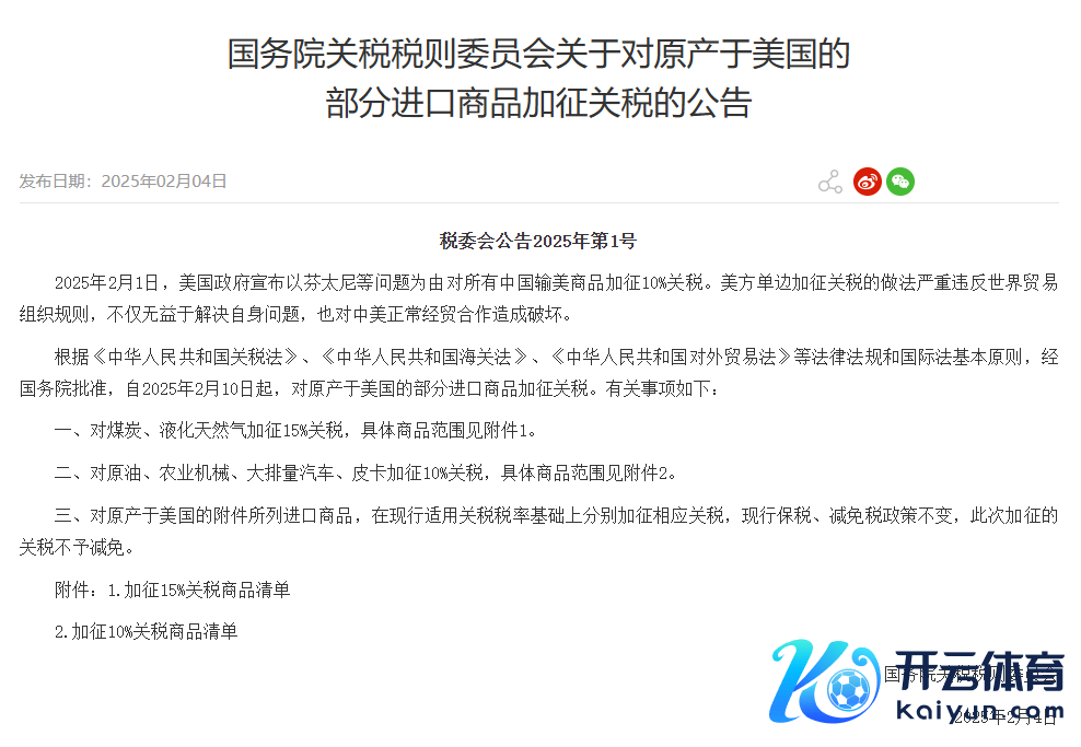 据新华社2月4日报说念,国务院关税税则委员会2月4日发布公告默示,经国务院批准,自2025年2月10日起,对原产于好意思国的部分入口商品加征关税。